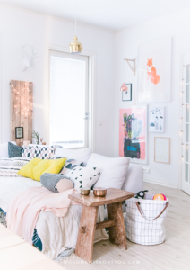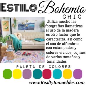 - Bohemio Chic: Es un estilo casual, lleno de colores y estampados ya sea en accesorios, muebles, cortinas o tapetes. Pero el uso de colores debe combinar, lo ideal es que sean en tonos pasteles para que dé suavidad a la decoración. Los tonos fuertes, que den contraste con el resto de tonos, podrían usarse en decoraciones pequeñas.