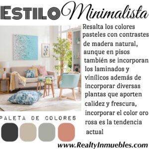 - Minimalista: Reconocido por su simplicidad y sentido estético, es la unión entre los materiales de la naturaleza con el diseño, sobre todo con piezas de diferentes formas y rectas geométricas, los tonos blancos en paredes y mobiliario para aportar iluminación dentro de los espacios , además de aportarse texturas en las paredes para separar los ambientes.