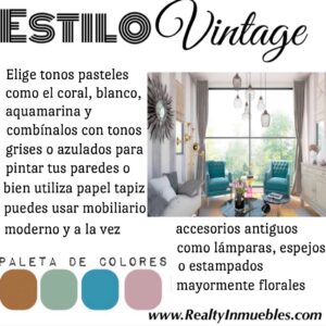 - Vintage: Promueve el uso de piezas antiguas más no es un estilo retro, ya que combina piezas modernas y viejas y mezcla texturas para dar una sensación de convivencia y equilibro entre lo antiguo y lo nuevo, es una buena mejor manera de revivir objetos de años pasados dentro de tu hogar.